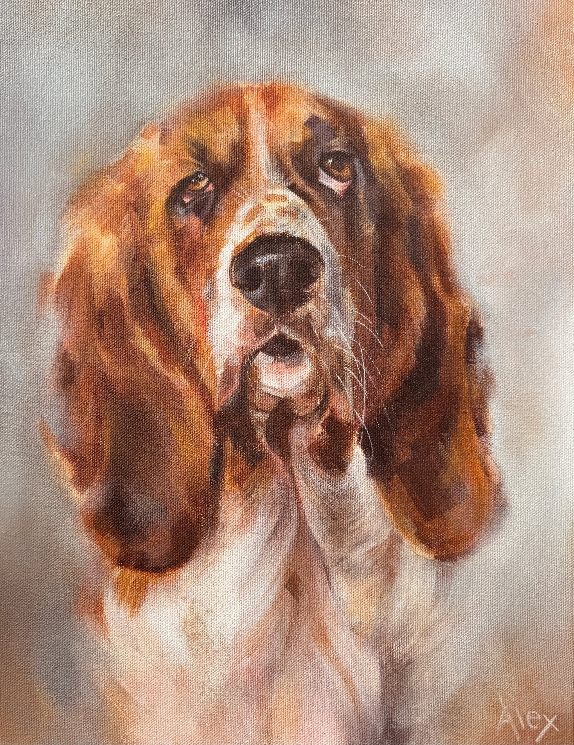 “Absolutely stunning painting of our dog, Casper. Alex was so helpful over message, checking in at different points throughout the process to make sure the colours etc were to our liking. Very happy with the end result!