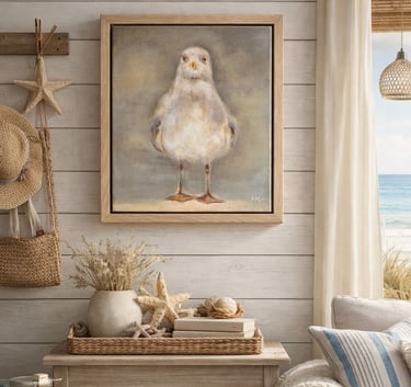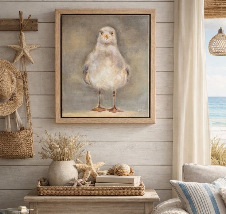 One thing I’ve found that makes a big difference on Pinterest is showing my paintings in situ. For example, if I create a pin of my seagull painting using just a straight photo of the artwork, it performs okay—but when I place that same painting into a living room or beach house mock-up, it performs far better. Seeing the artwork in a real-life setting helps people imagine it in their own space, which makes it more appealing and more clickable.