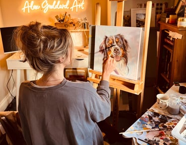 I’m a pet portrait and wildlife artist based in West Sussex, UK, creating paintings that celebrate the deep bond we share with animals. From my cosy home studio, I paint custom portraits for clients who want to capture the personality and spirit of their beloved pets.