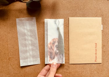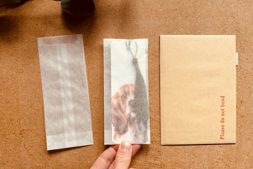 Now moving onto supplies I use to package up my paintings. I start with a layer of acid free tissue paper, its important to get acid free so that the paper doesn’t react with the canvas surface in anyway. I will then wrap in brown kraft paper and tie with some green twine. I include a business card and a painting care guide. For my greeting cards, as I mentioned they are packaged in a compostable free plastic sleeve and for my bookmarks I found some glassine bags on amazon which are the perfect fit.